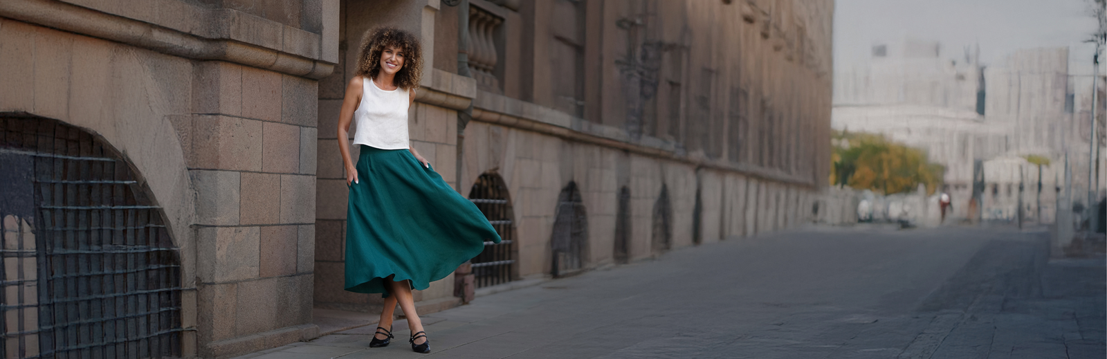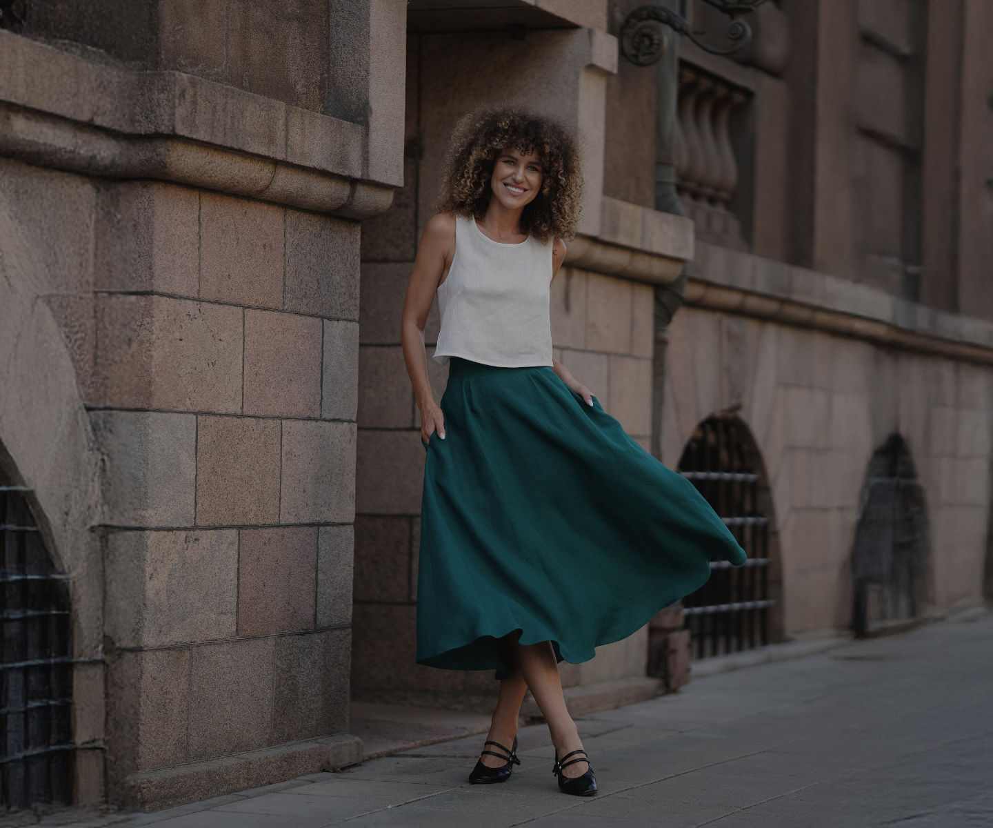 Woman wearing stone green linen skirt Sophia.