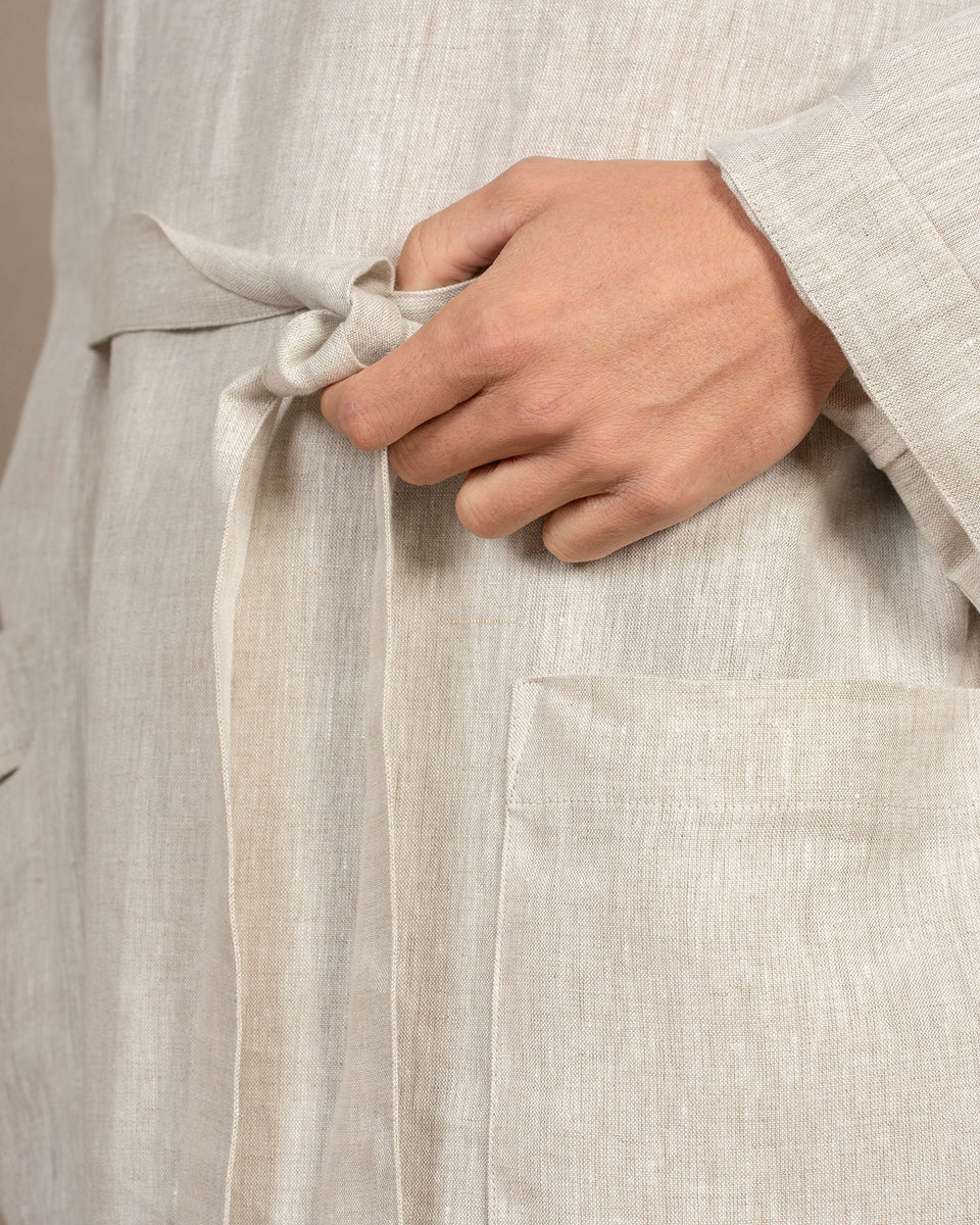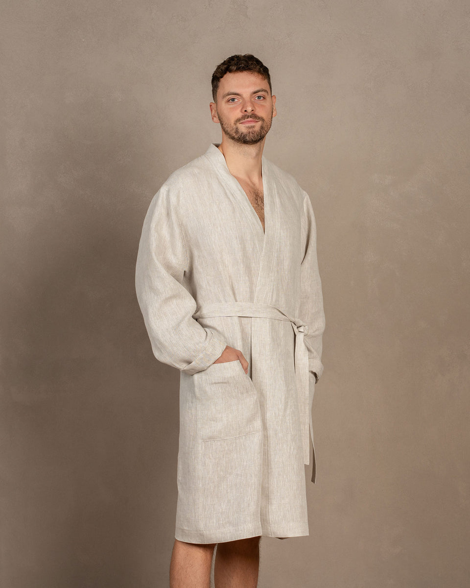 Entdecken Sie die perfekte Kombination aus Komfort und Praktikabilität mit dem 100 % Leinen-Bademantel für Herren. Hergestellt aus hochwertigem Leinen, verbindet dieser kurze Bademantel weiches, leichtes Material mit einem robusten, strapazierfähigen Gefühl und sorgt so für einen raffinierten, maskulinen Look. Die natürliche Farbe und das minimalistische Design verleihen einen Hauch von mühelosem Stil, während der umweltfreundliche, natürliche Leinenstoff einen eleganten Look schafft. Atmungsaktiv und saugfähig ist dieser Leinenbademantel für eine entspannte Passform und einfache Bewegungsfreiheit konzipiert, ideal zum Entspannen nach der Dusche, für Wochenendfaulenzen oder um Ihrer Morgenroutine einen Hauch von Eleganz zu verleihen.