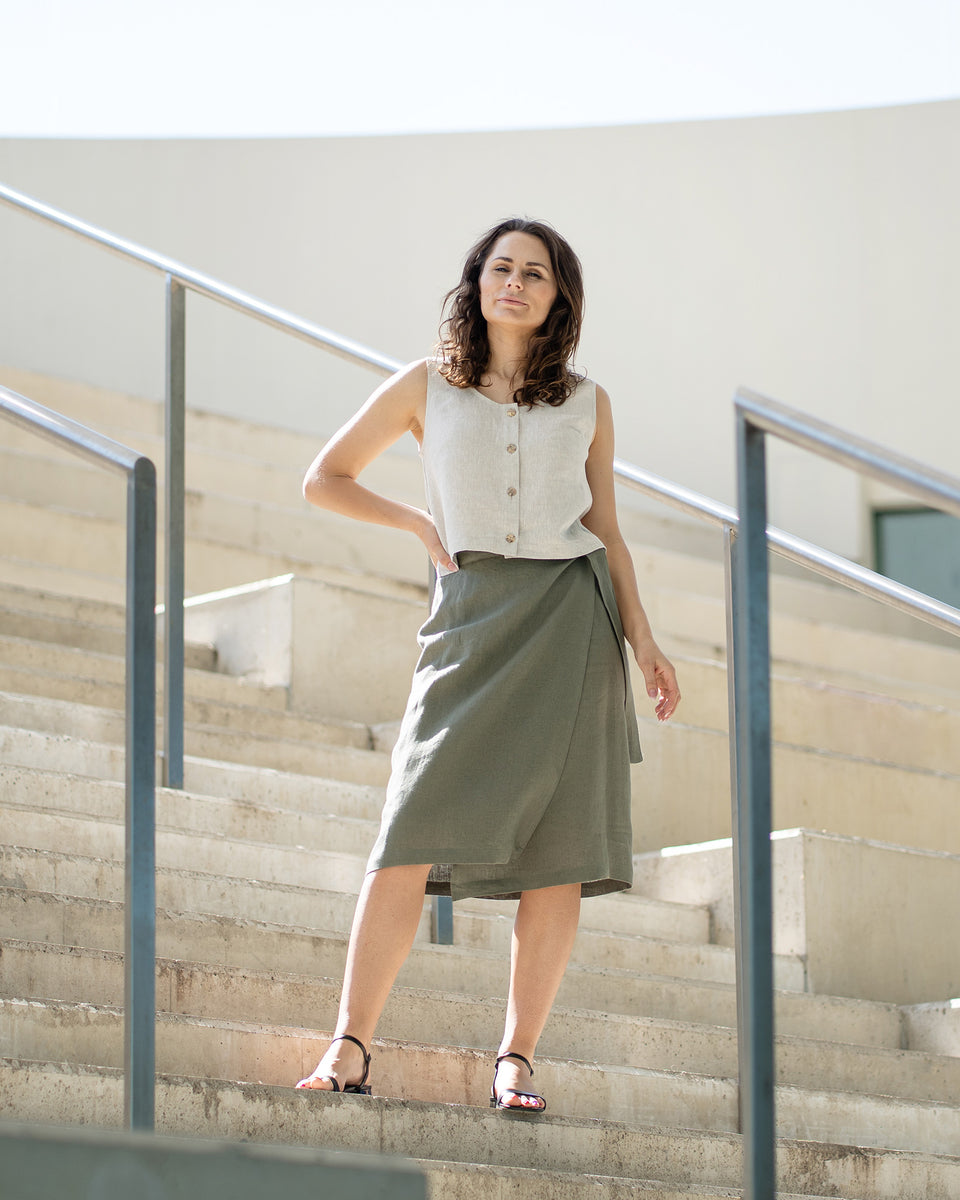 Das Leinen-Crop-Top Monica besticht durch eine charmante Knopfleiste mit Muschelknöpfen. Veredelt mit einem Rundhalsausschnitt, strategisch platzierten Brustabnähern und BH-freundlichen Trägern, verspricht das Leinen-Crop-Top eine schmeichelhafte und bequeme Passform, die es sowohl für den Alltag als auch für semi-formelle Anlässe geeignet macht.