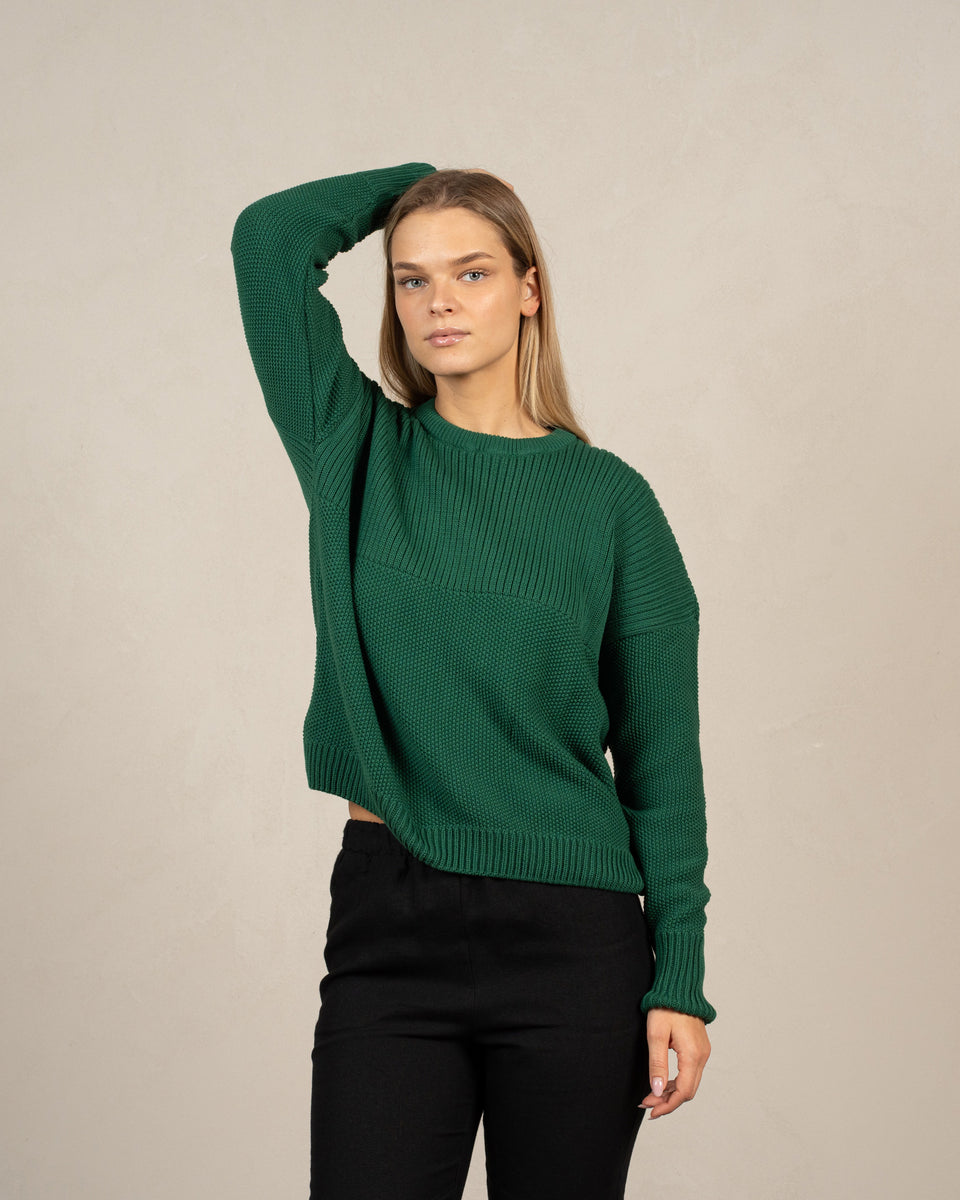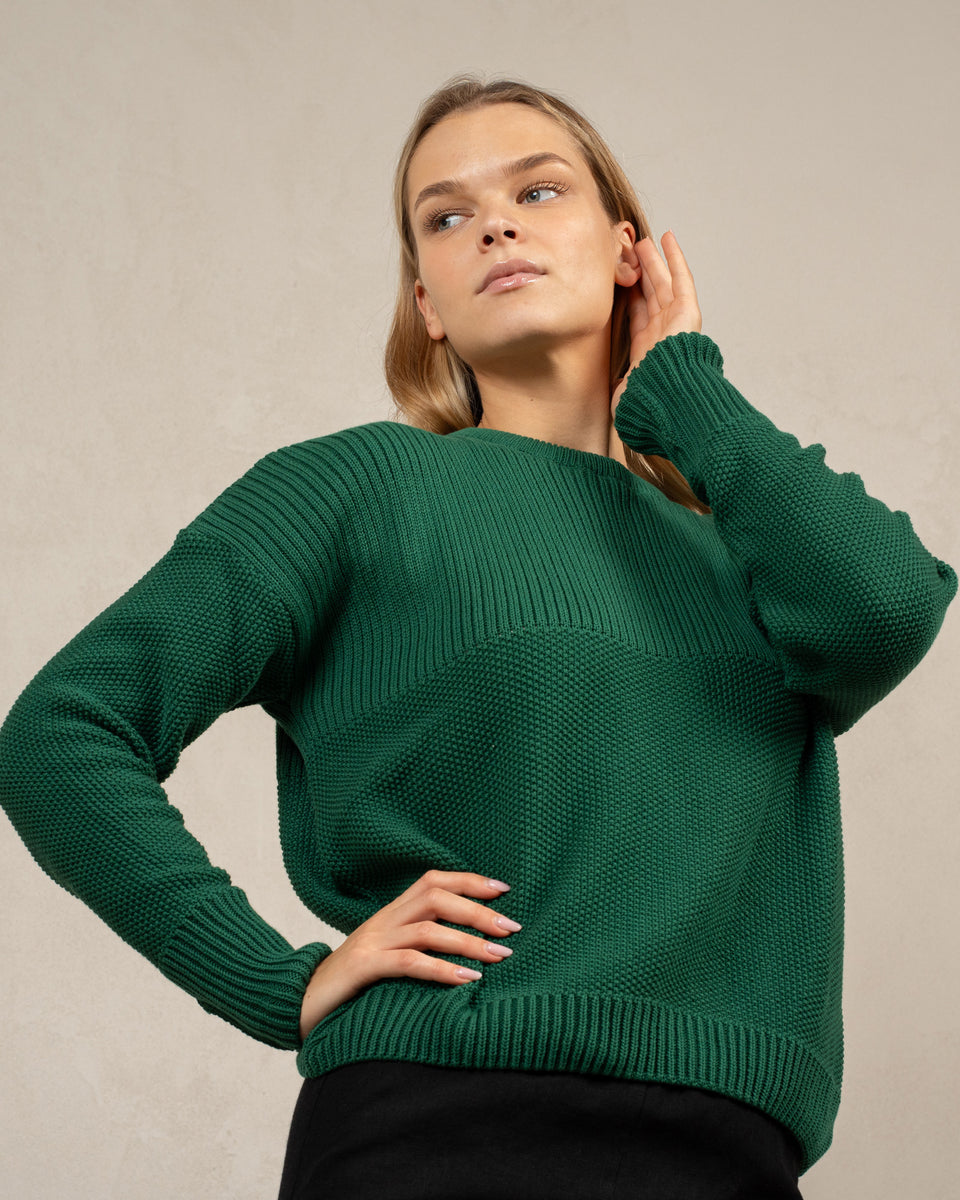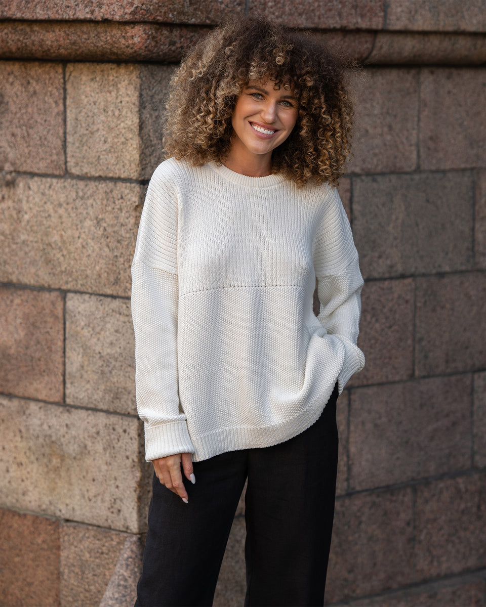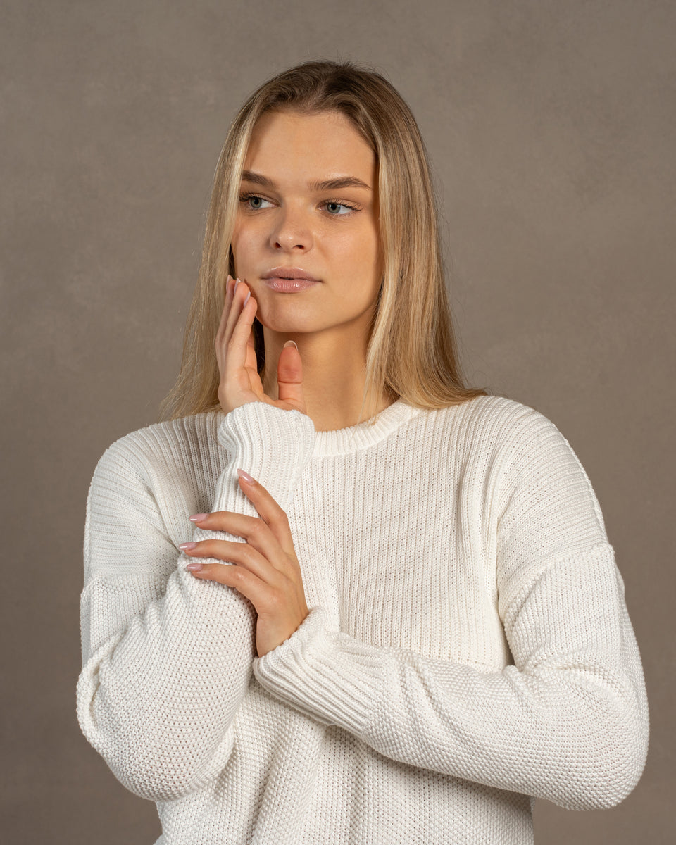 Aus 100 % gekämmter Baumwolle gestrickt, bietet dieser Strickpullover eine perfekte Kombination aus Komfort, Langlebigkeit und Stil mit seinem weichen, atmungsaktiven Stoff und minimalistischen, langärmeligen Design. Die gerippten Strickbündchen und der Saum verleihen einen Hauch von Eleganz, während das Wabenstrickmuster als einzigartiges Detail dient, was ihn ideal für sowohl legere als auch professionelle Outfits macht.